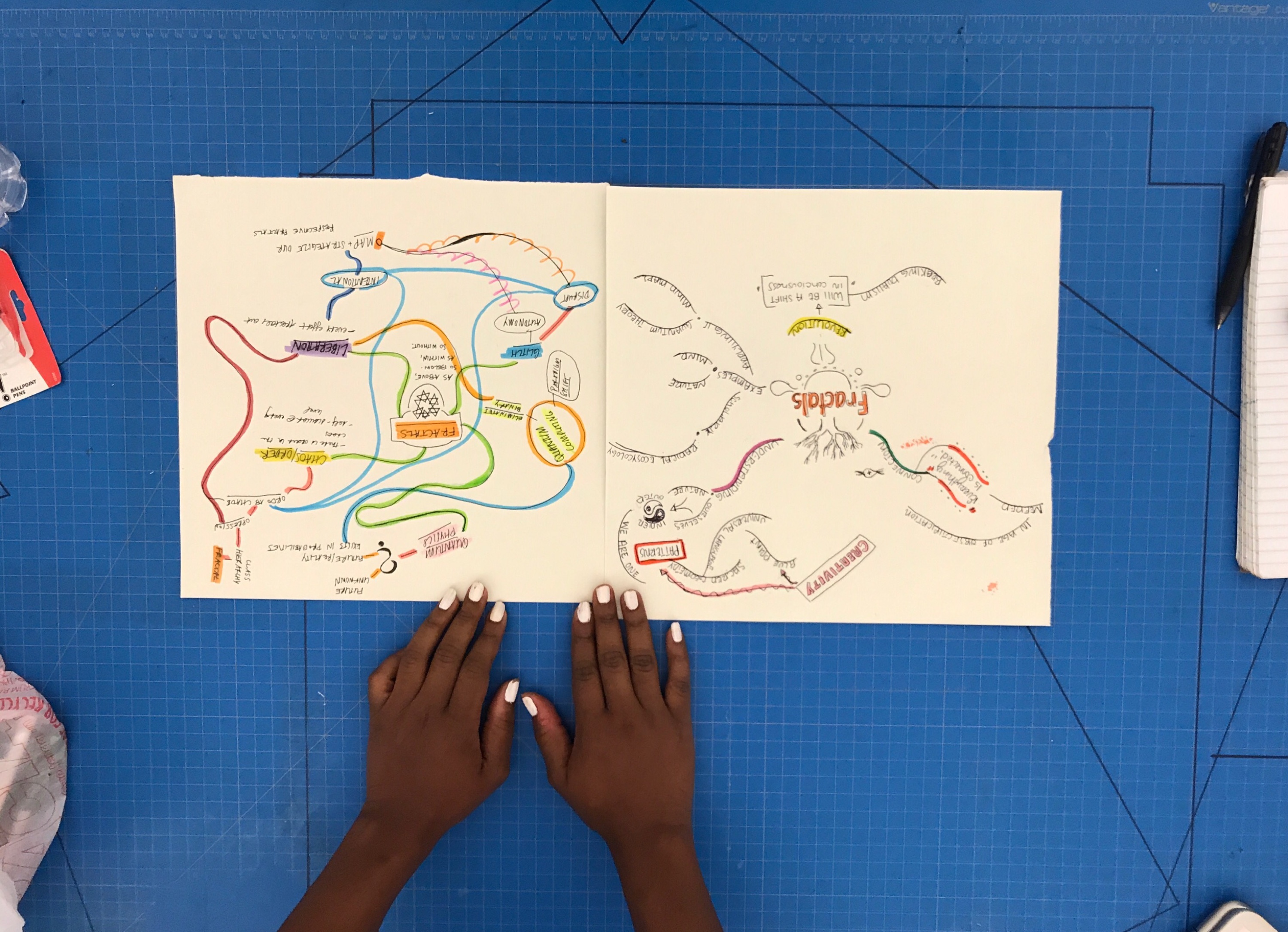 most recently disturbed blank pages feature mind maps, automatic writing, affirmations, and to-do lists. mind maps with nuclei like ‘fractal project’ or ‘afrofuturism’; derivatives like ‘use of music + dance to communicate that which may only occur in some future: be it the first sign of spring, the hour before the rooster moans, or the three hours massa and his family are away at sunday service.’ automatic writing about John Coltrane, my former residencies, my potential futures. affirmations to clarify them. to-do lists to reel them in. to-do list with practicalities like «create a reality and stay in it.»